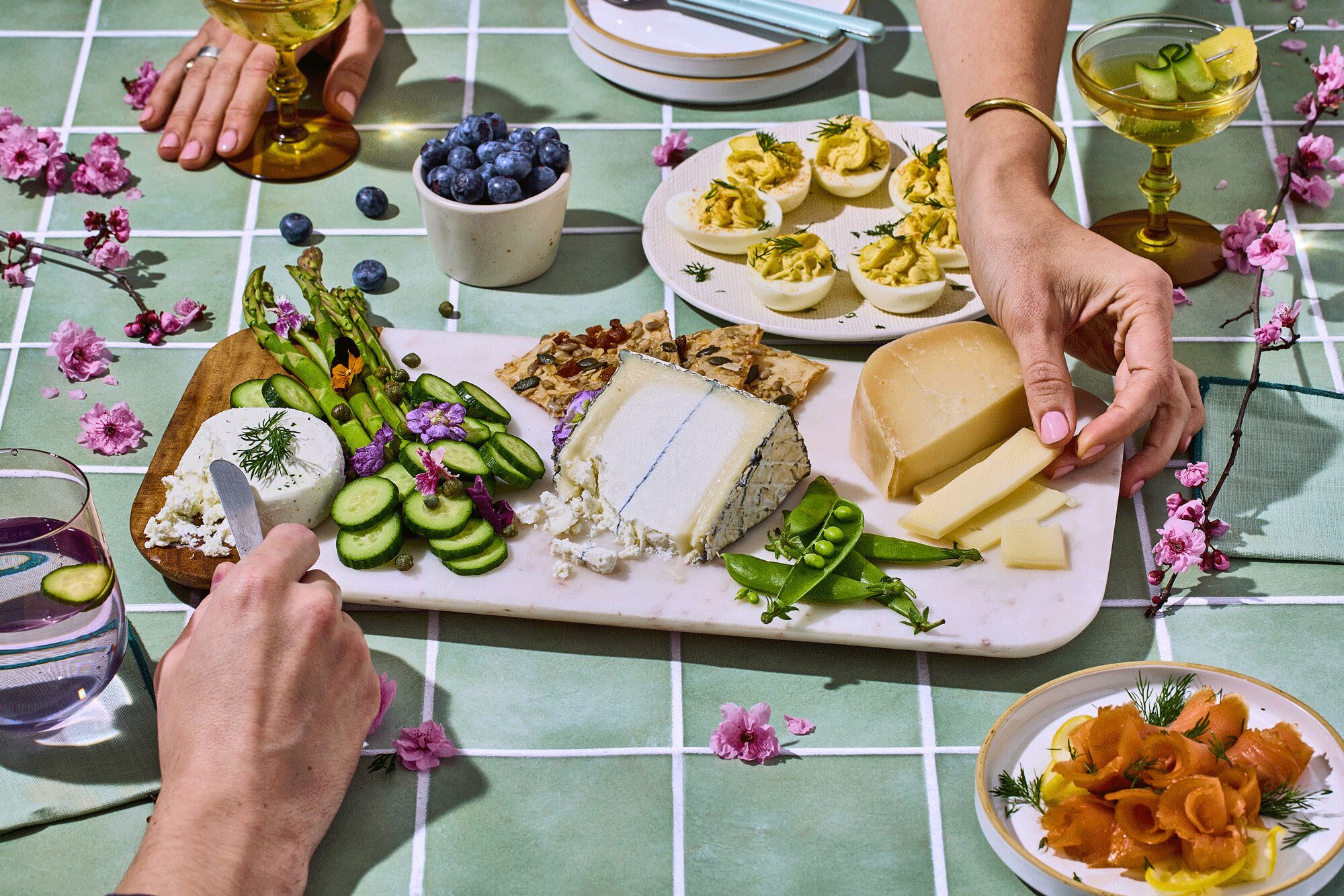 A fresh spring cheeseboard featuring Humboldt Fog, PsycheDillic, and Lamb Chopper paired with seasonal veggies, fruit, and light accompaniments.